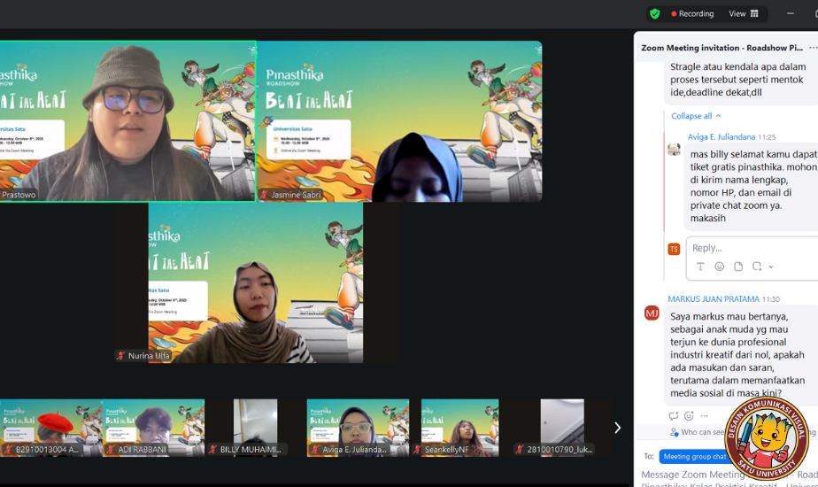 Sebagai bagian dari rangkaian Roadshow Pinasthika Creativestival 2025, Jurusan Desain Komunikasi Visual Universitas Satu ikut serta dalam kegiatan inspiratif bertajuk “How to Understand Brief & Craft Creative Campaign” pada 8 Oktober 2025. Acara ini digelar secara daring melalui platform Zoom Meeting dan diikuti oleh mahasiswa DKV serta sivitas akademika Universitas Satu dan juga dari Industri kreatif yang ikut langsung dalam kegiatan tersebut.