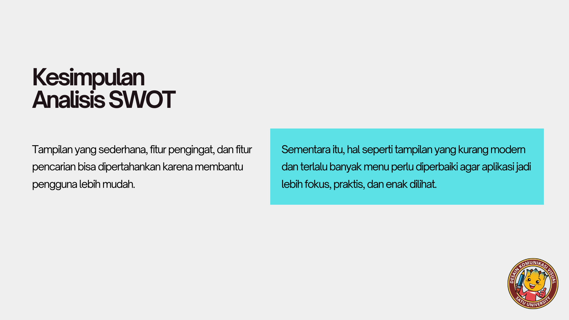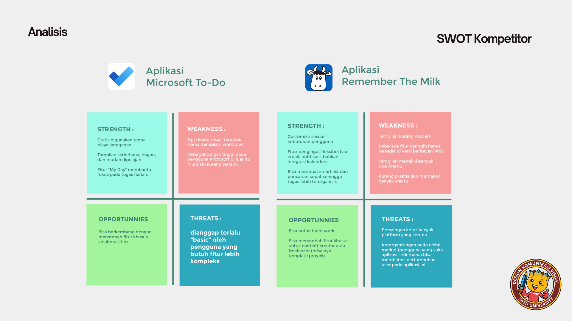 Hasil analisis kompetitor memastikan aplikasi yang dirancang memiliki value yang unik dan relevan.
