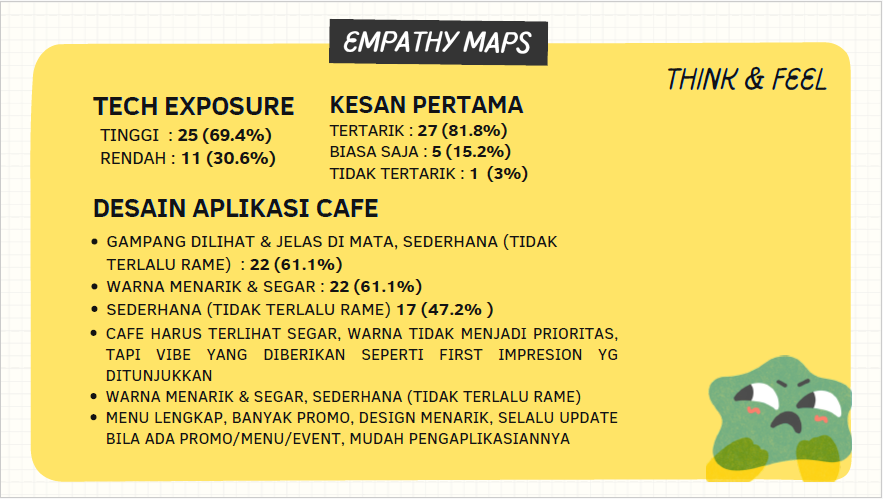 Empathy map bukan hanya alat visual, tetapi fondasi strategis untuk menciptakan pengalaman pengguna yang benar-benar relevan terutama untuk brand café dengan target pengguna muda yang mengutamakan kecepatan, estetika, dan kenyamanan