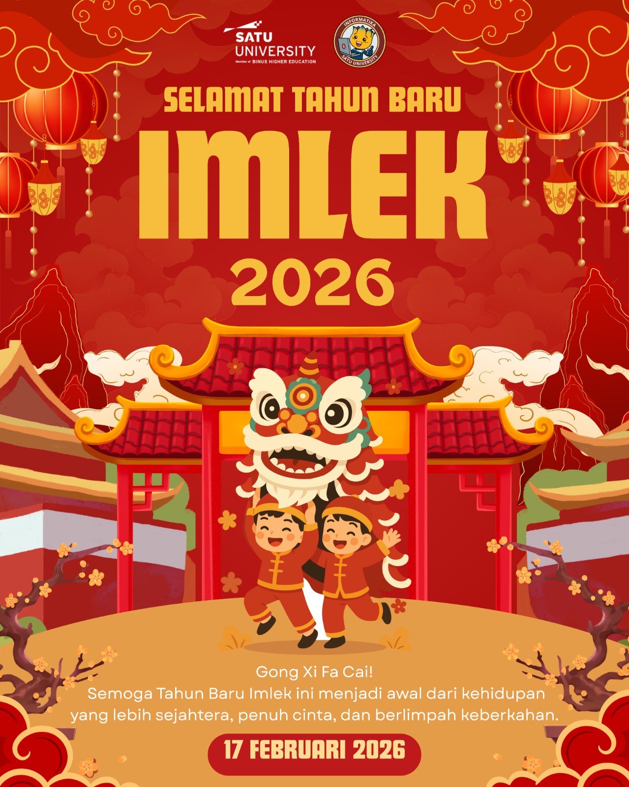 Program Studi Informatika Satu University mengucapkan Selamat Tahun Baru Imlek 2026 kepada seluruh mahasiswa, dosen, tenaga kependidikan, alumni, serta mitra yang merayakan.