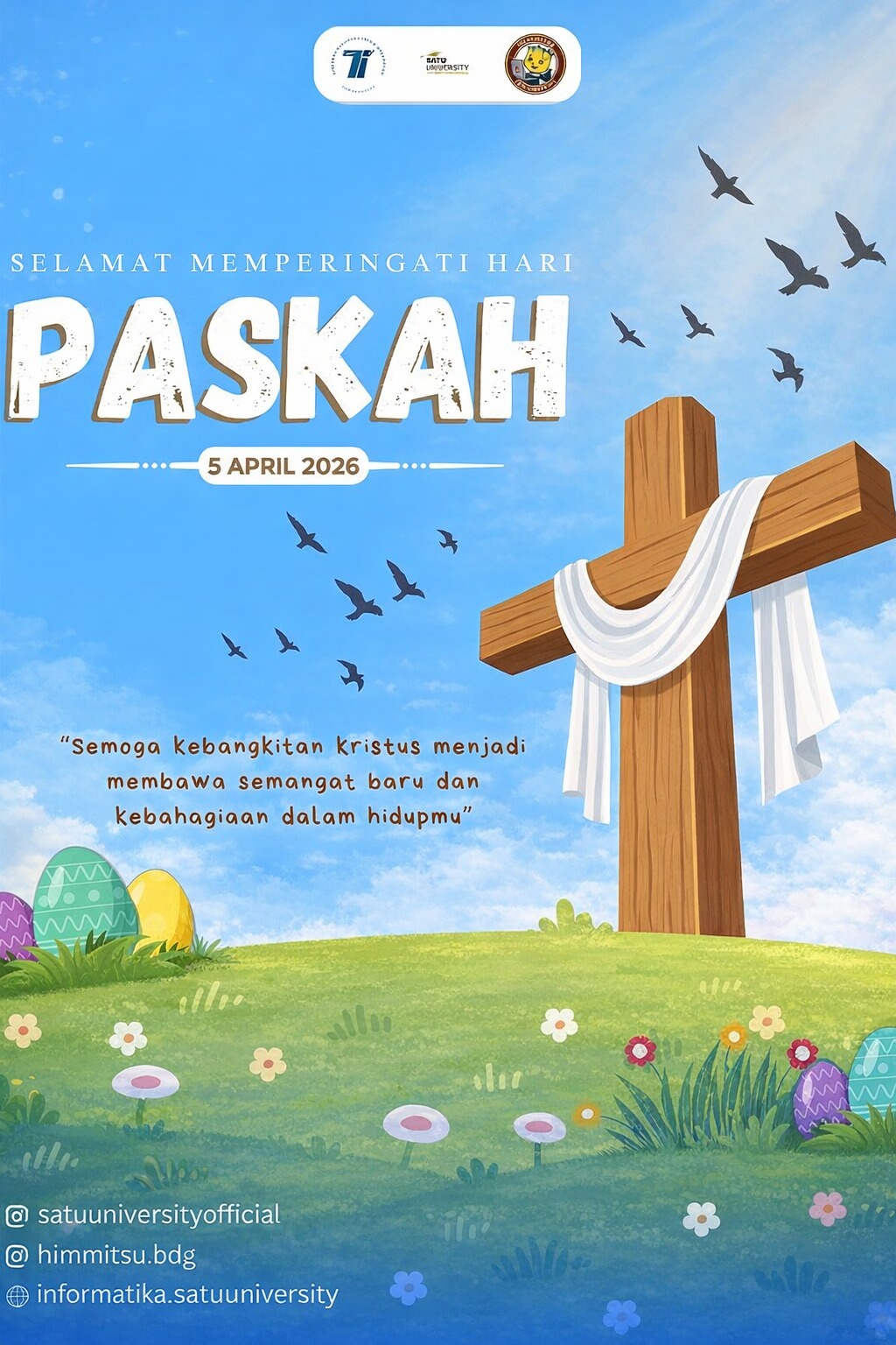 Keluarga besar Program Studi Informatika Satu University bersama HIMITSU (Himpunan Mahasiswa Informatika Satu University) mengucapkan Selamat Hari Paskah kepada seluruh umat yang merayakan.