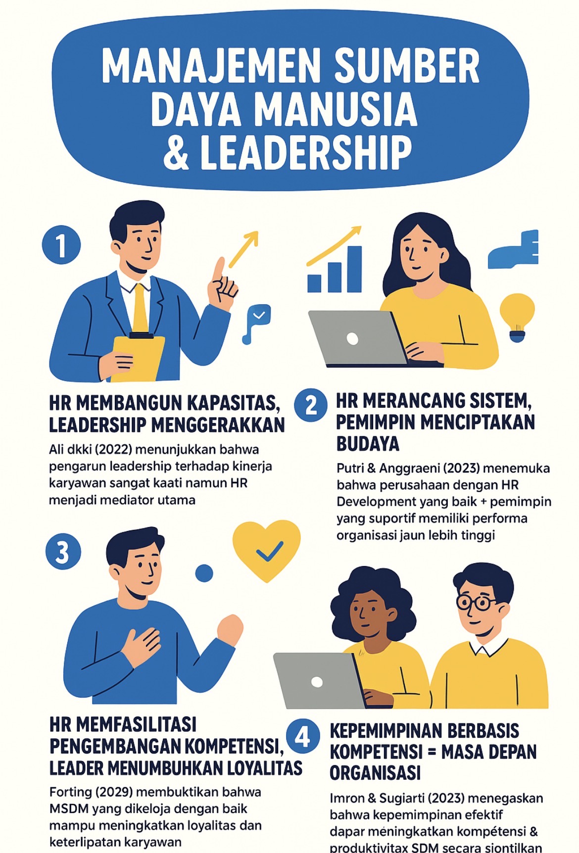 Ali dkk. (2022) menegaskan bahwa pengaruh leadership terhadap kinerja karyawan sangat kuat, namun HR menjadi mediator utama yang menentukan apakah pengaruh tersebut tercapai maksimal atau tidak.