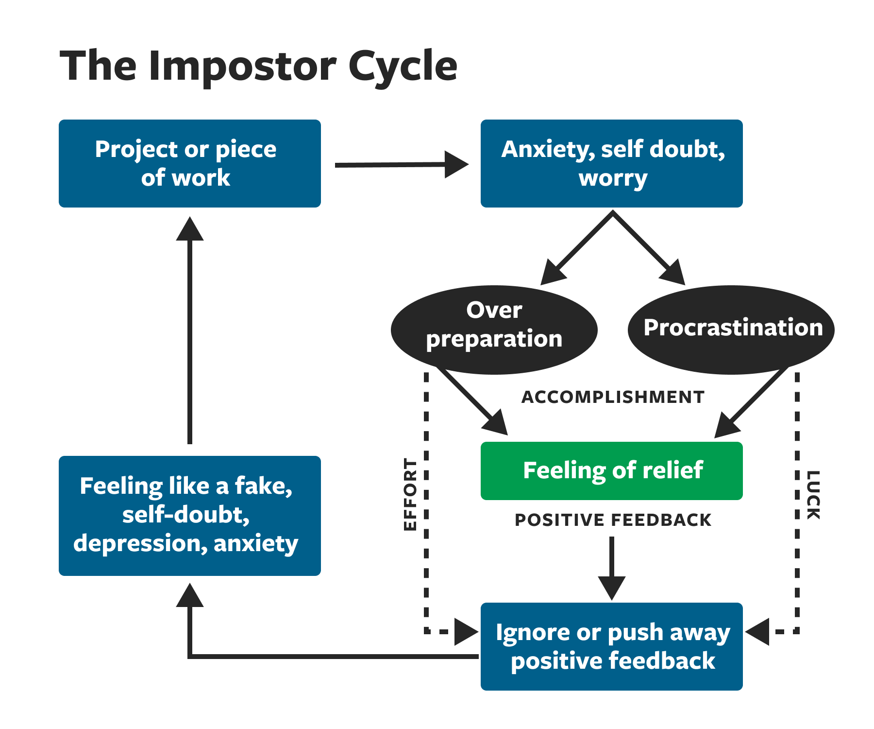 Dalam siklus ini, individu memulai dari kecemasan saat menghadapi tugas, lalu merespons dengan overpreparation atau prokrastinasi. Meskipun akhirnya berhasil, keberhasilan tersebut tidak diakui sebagai kemampuan diri, melainkan dianggap sebagai keberuntungan atau faktor eksternal. Akibatnya, rasa tidak percaya diri kembali muncul dan siklus terus berulang.