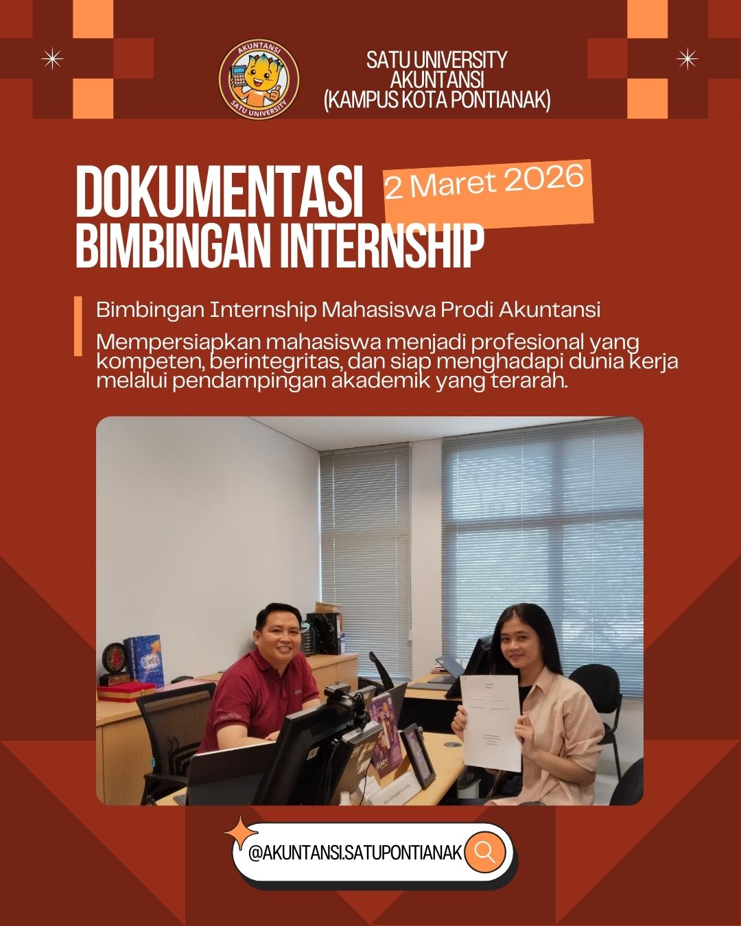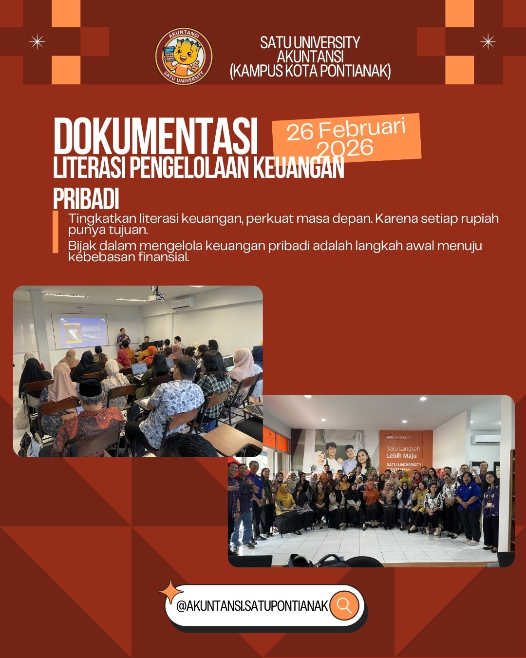 SATU University Kampus Pontianak menyelenggarakan kegiatan Literasi Pengelolaan Keuangan Pribadi yang disampaikan oleh Bapak Erwin Febriansyah, S.E., M.Ak., WPPE., CAP. Kegiatan ini diikuti oleh Guru SMA se-Kota Pontianak dan Kabupaten Kubu Raya sebagai bentuk penguatan kapasitas pendidik dalam memahami serta mengelola keuangan secara bijak dan terencana. Dalam pemaparannya, narasumber menjelaskan pentingnya perencanaan keuangan, pengelolaan arus […]